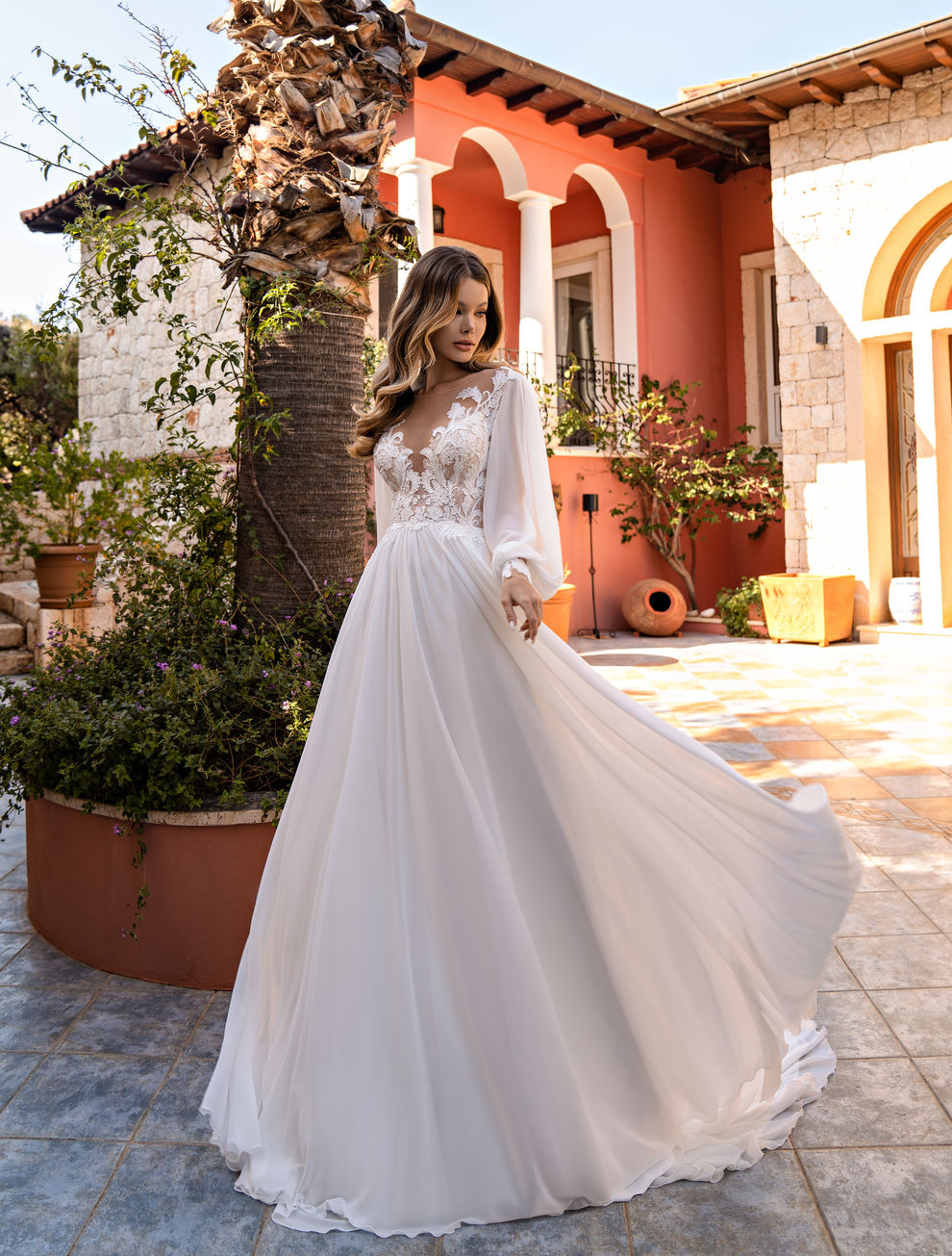 Discover absolute refinement in this wedding dress, designed to highlight the silhouette through delicate lace and a sheer veil. The flowing cut, with airy sleeves and a discreet belt, gives a touch of classic femininity, making it perfect for a sophisticated evening dress as well. Hand-embroidered details, premium materials, and comfortable lining transform every step into a gesture of elegance, ideal for a formal event. A design that blends modernity with tradition, dedicated to the soul seeking a feminine presence.