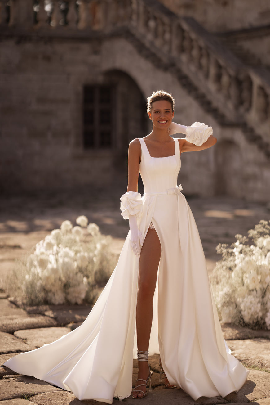 An opulent wedding dress with a square neckline and a daring slit on the leg - a combination of timeless grace and untamed passion.