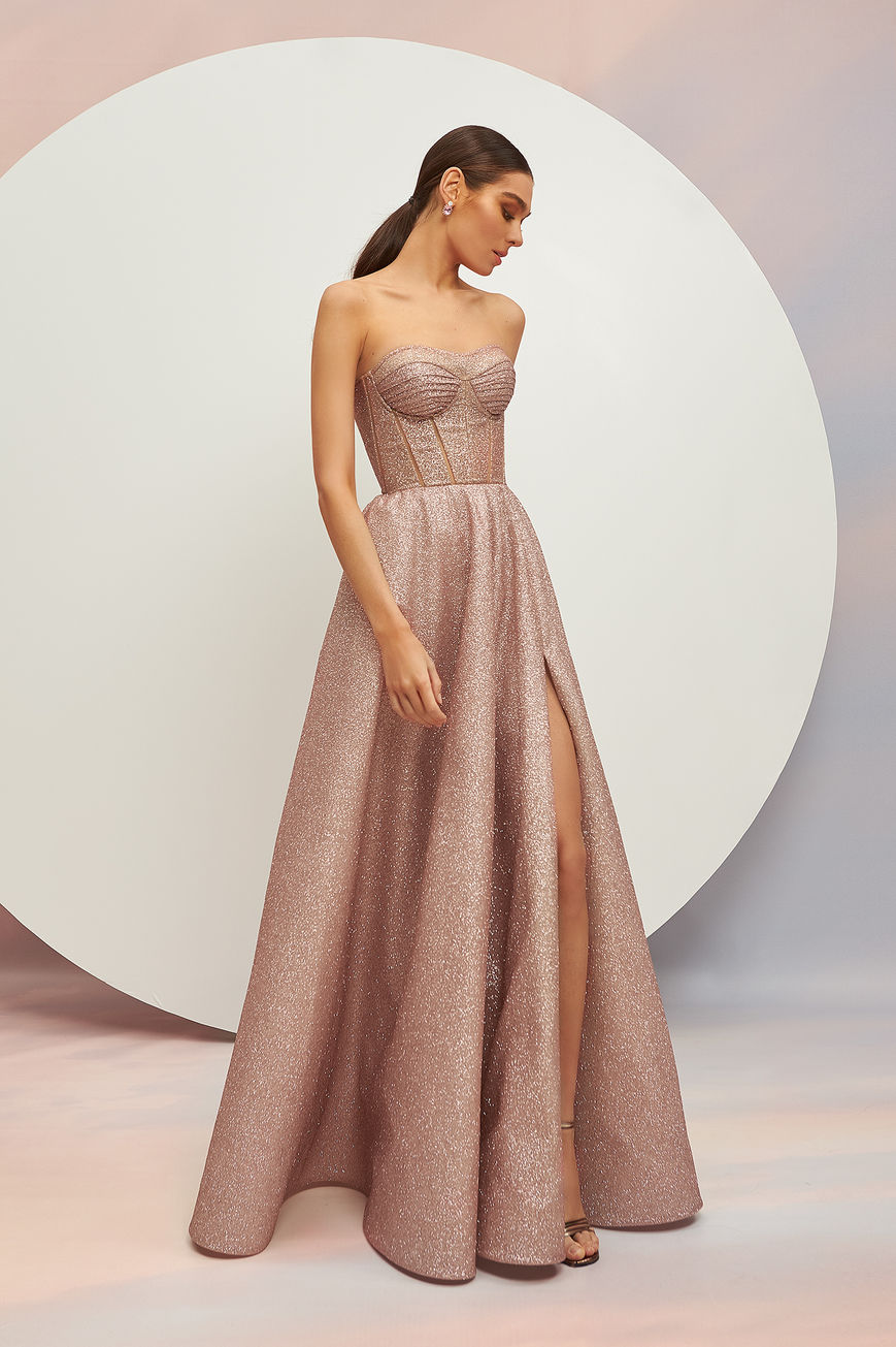 EVENING DRESS FRIDA made from shimmering fabrics with cut-outs on the corset and draped cups.