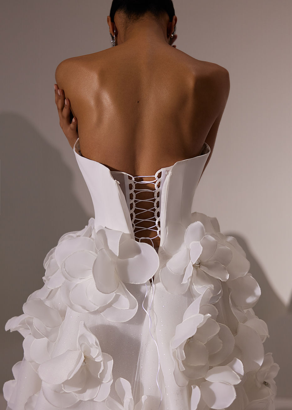 These oversized flowers add an avant-garde element, making the dress stand out as a wearable piece of art. Each flower is meticulously crafted.