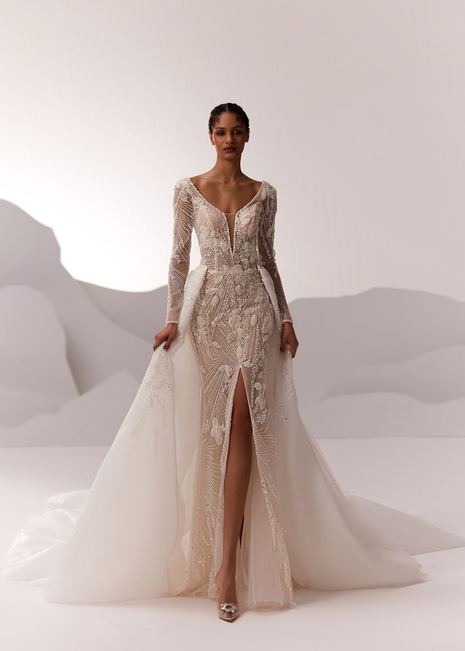 A high front slit adds a modern and bold element to the traditional bridal look.