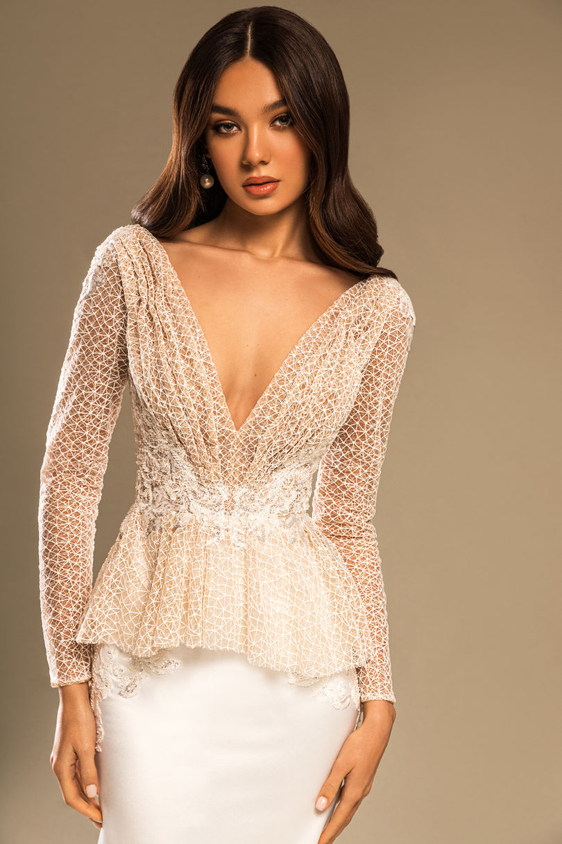 The bodice is made of lace, featuring a fitted V-neckline at the waist and long sleeves.