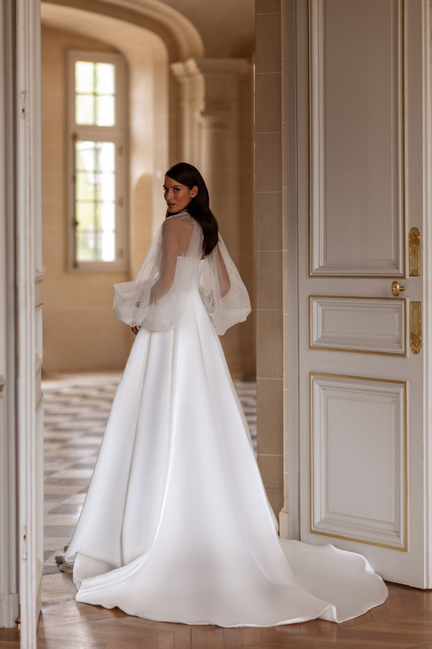 IVORY TAFFETA WEDDING DRESS WITH BOLERO SLEEVES.