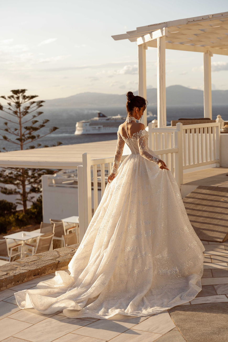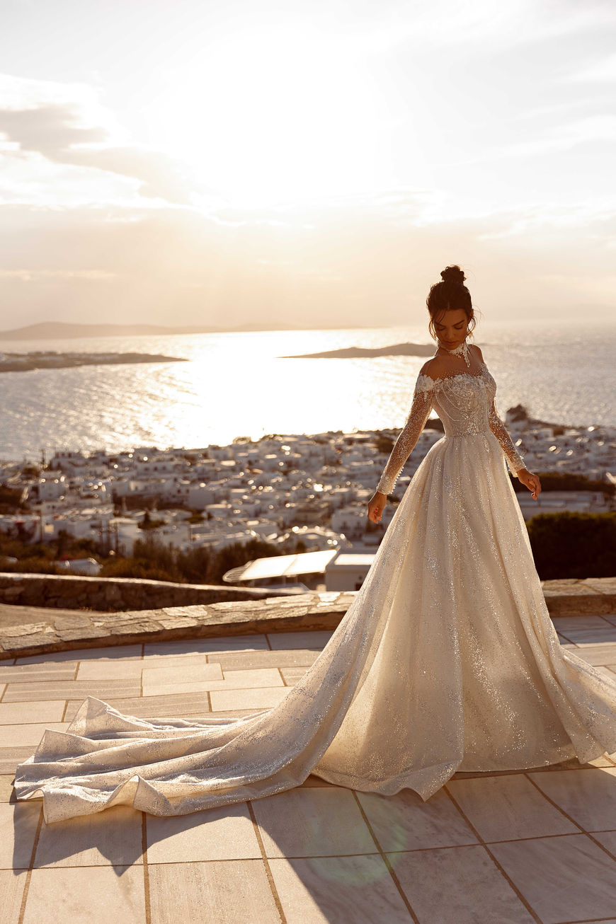 Imagine a flawless silhouette in a wedding dress that combines delicate embroidery with luminous textures; the tailored corset and delicate sleeves shape a discreet yet alluring presence. Designed for a memorable evening dress, the fluid materials drape gracefully, creating a refined line. Subtle finishes and precious details convey elegance, while the highlighted cut maintains a deeply feminine touch. Ideal for any formal event, this creation promises to turn every step into an unforgettable moment.