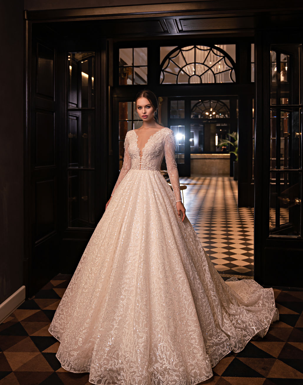 Princess-style wedding dress with lace, sleeves, and a V-neckline.