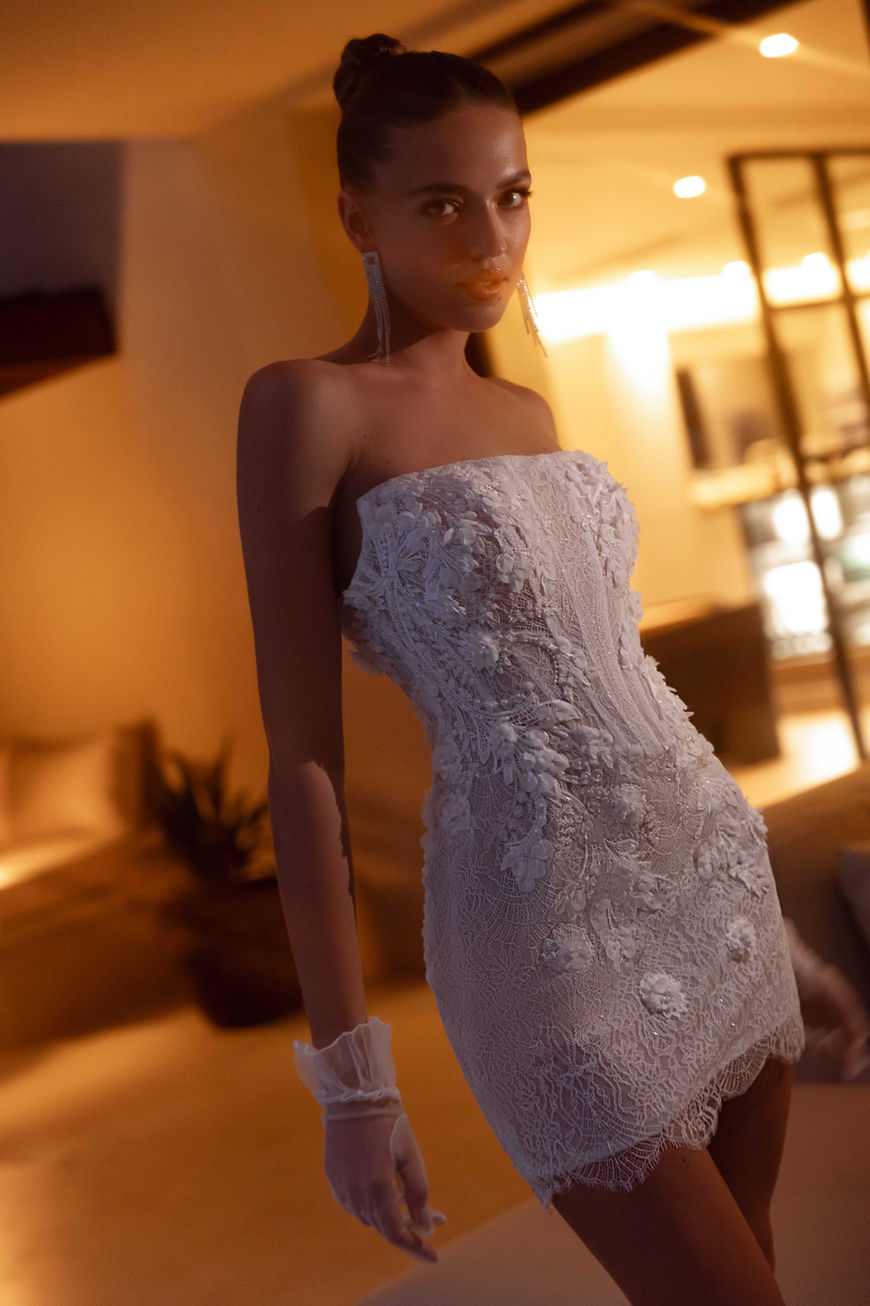 WINONA SHORT DRESS is a charming short dress made from Chantilly lace with floral appliqués.