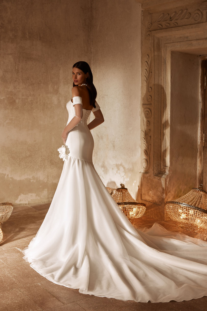2 IN 1 JENNIFER TRANSFORMER DRESS reveals 3 different looks for you. A complete set with gloves offers a sophisticated wedding look. However, as soon as you remove the detachable skirt, you will transform into a fashionable bride with a refined classic style. For your special evening, we have maintained the look of a mini dress with bold floral accents.