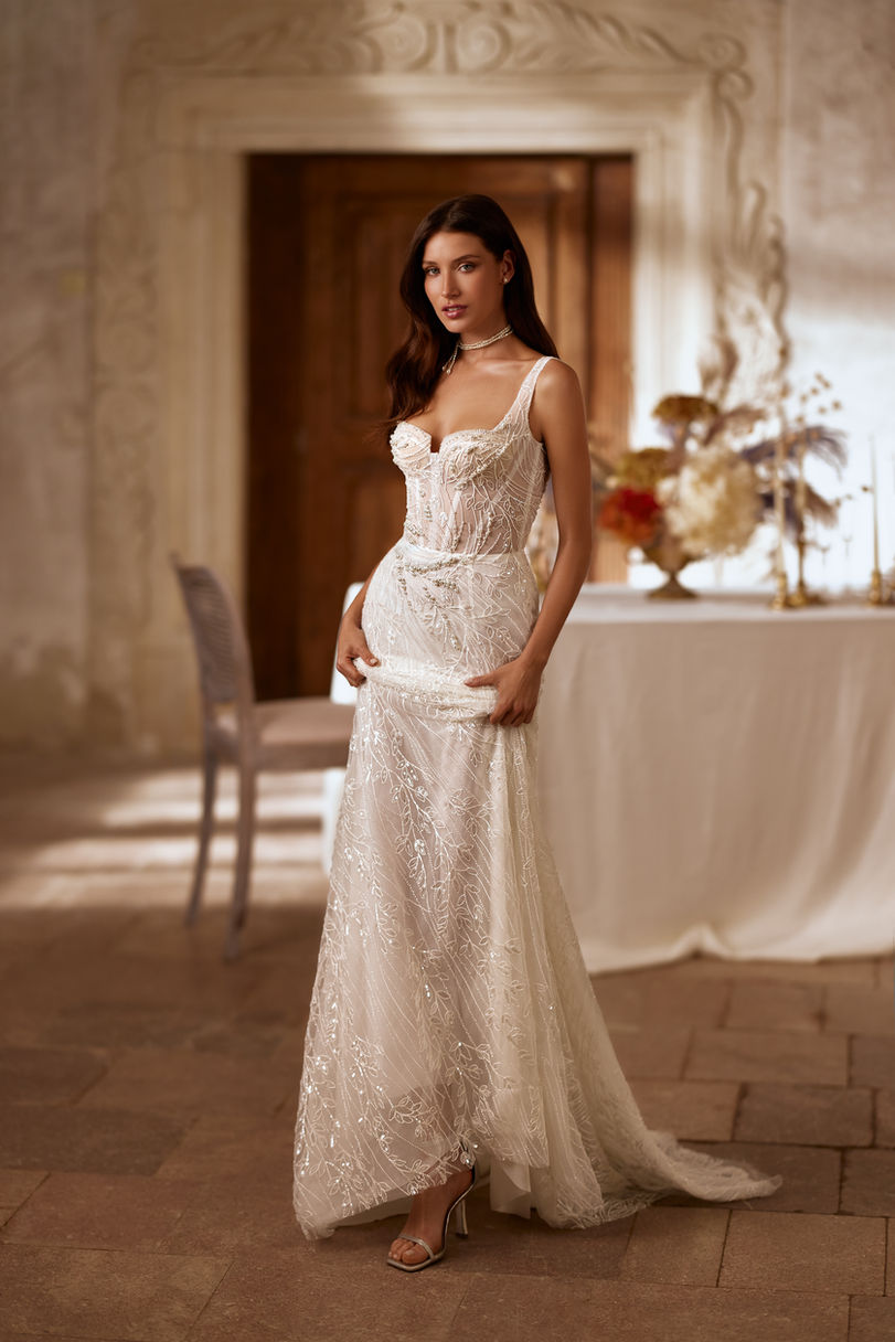 The BOUDICCA WEDDING DRESS impresses with its delicacy and elegance. The refined corset, with thin straps, draws attention to the shoulders and the bride's delicate neckline, adding a touch of romance.