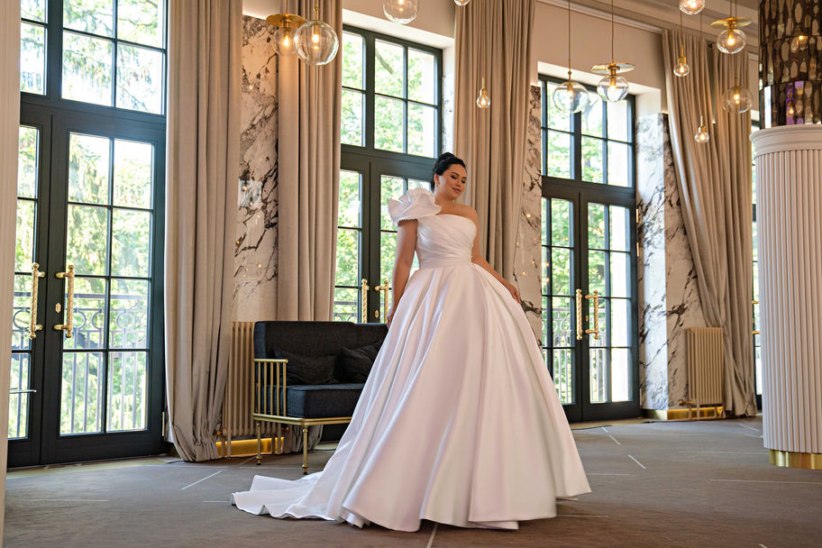 This minimalist NINA wedding dress is made from a luxurious fabric that adds a touch of glamour.