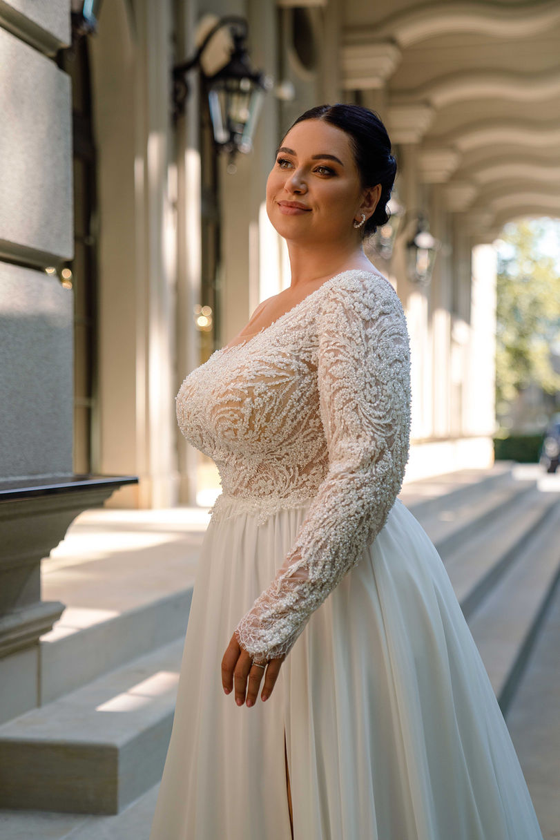 The NISHA Wedding Dress with long sleeves adds elegance to the look, while the train and side slit create a sense of ease.