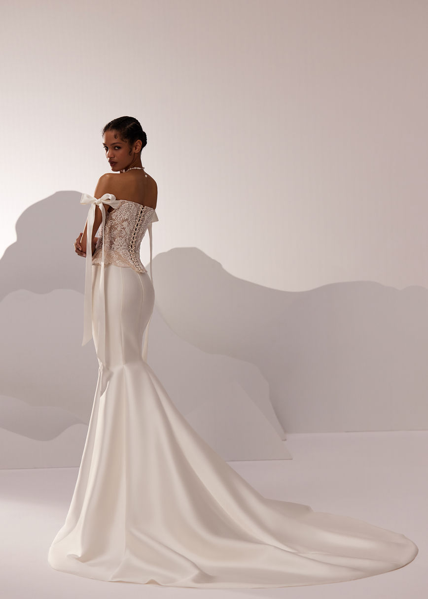 The POLLARDI WEDDING DRESS is a remarkable and avant-garde gown, featuring a unique blend of textures.