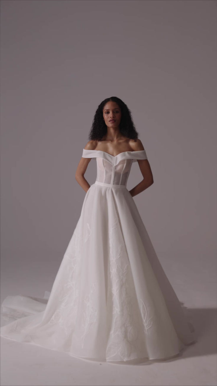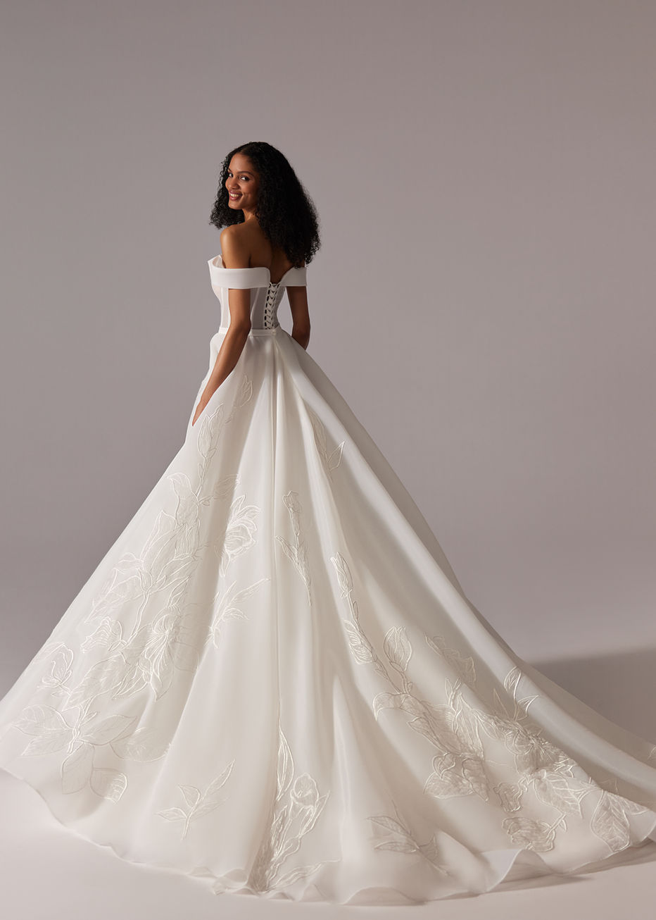 The SILK PRINTED ORGANZA WEDDING DRESS features an off-shoulder neckline that gracefully highlights the bride's shoulders and collarbone, adding a touch of romance and sophistication.
